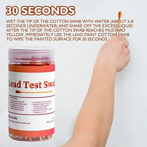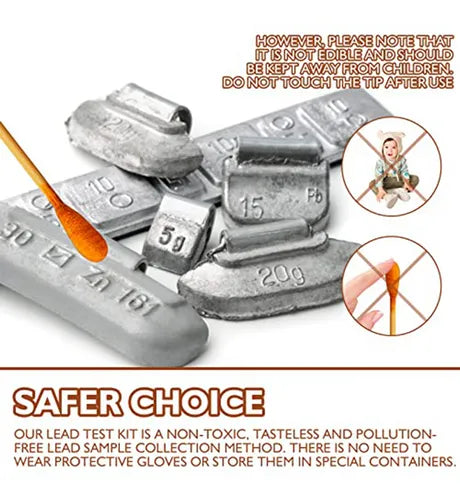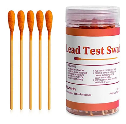 • Kit de prueba de plomo fácil de usar: simplemente sumerja el hisopo en agua y límpielo. Frote el hisopo sobre la zona a tratar. Si el hisopo se vuelve rojo o si hay plomo en él.