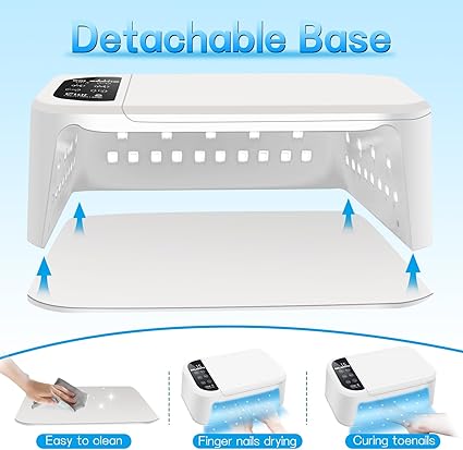 • Pantalla LCD táctil y base extraíble: la pantalla LCD en la luz UV de gel para uñas puede mostrar claramente el tiempo de curado. Establece tu tiempo de curado con un simple toque. El diseño de lámpara de uñas de gel con una base desmontable es muy fácil de limpiar. La base extraíble también tiene una tira de parachoques para evitar que tu arte de uñas dañe tu arte de uñas