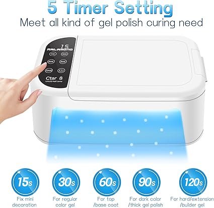• 5 ajustes de temporizador y sensor automático: cuenta con 5 temporizadores (15s/30s/60s/90s/120s), la luz LED de uñas para uñas de gel satisface diferentes necesidades de secado de esmalte de uñas de gel. Con sensor infrarrojo incorporado, la luz ultravioleta de uñas puede detectar tu mano y encender/apagar automáticamente. Luz UV de uñas con sensor automático libre de operación manual. De mano, luz encendida. Entrega, luz apagada