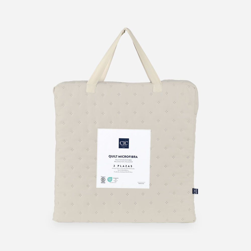El Quilt CIC en tamaño 2 plazas, confeccionado color Taupe en microfibra muy suave, proporciona una textura extremadamente suave al tacto, además de ser ligera y fácil de mantener. Estilo capitoné, que se caracteriza por puntos de presión distribuidos uniformemente en la superficie del Quilt, creando un efecto acolchado con pequeños pliegues en forma de puntos. Este diseño aporta un toque elegante y clásico.